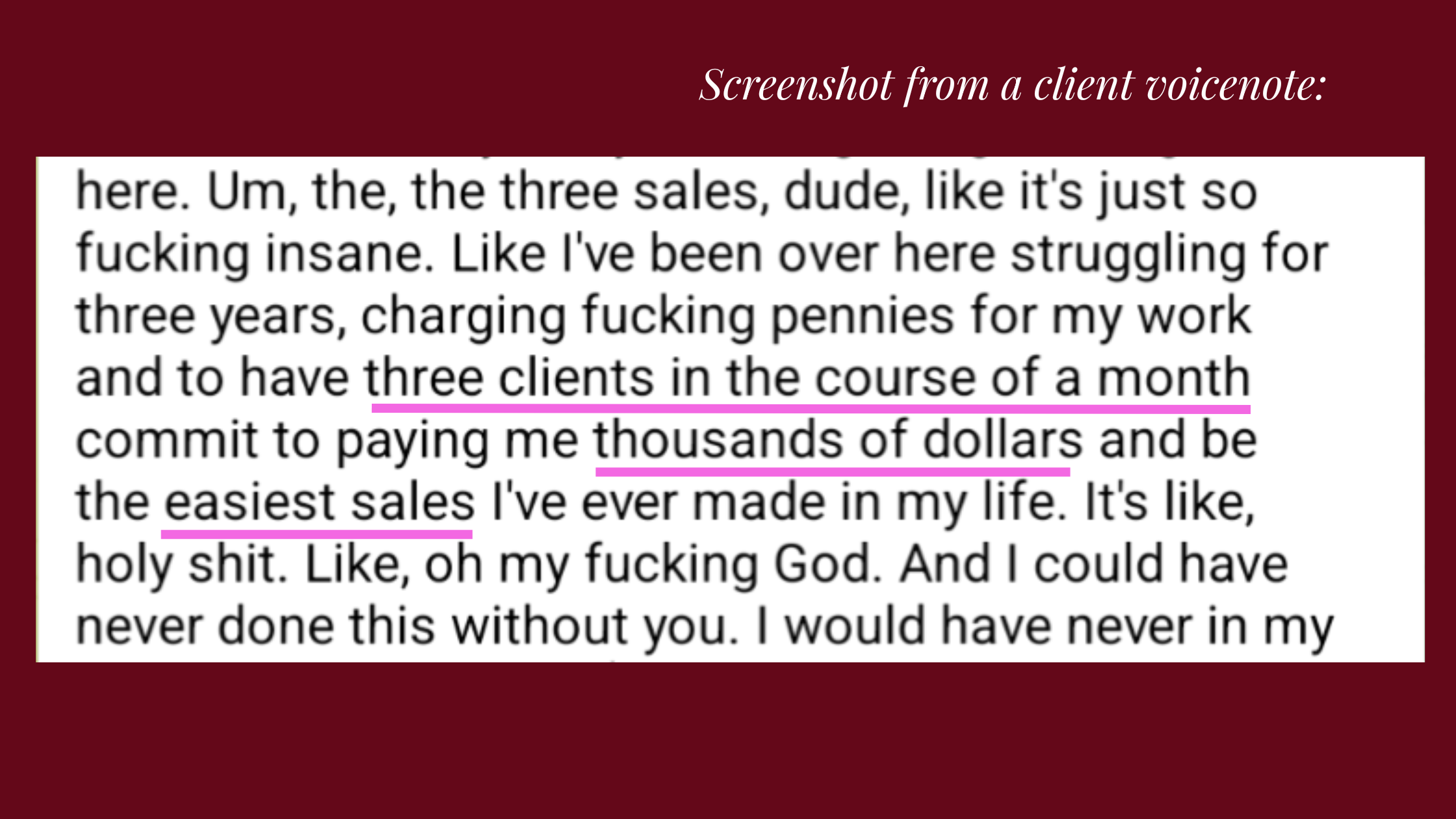 This looks like getting great results for your clients, but then when you go to raise your prices multiple dream clients say “no thank you.”